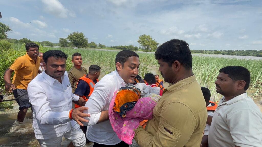 बीड मतदार संघातील शिरापूर गात येथे पुराच्या पाण्यात काही नागरिक अडकले होते. त्यामध्ये एका महिलेसह लहान बाळ अडकल्याची माहिती मिळताच आ.संदीप क्षीरसागर हे तात्काळ घटनास्थळी पोहचले. त्यांनी आपत्ती निवारण विभागाच्या मदतीने सर्व नागरिकांसह पुरात अडकलेल्या एक महिलेसह तिच्या लहान बाळाला सुरक्षित ठिकाणी स्थलांतरित केले.